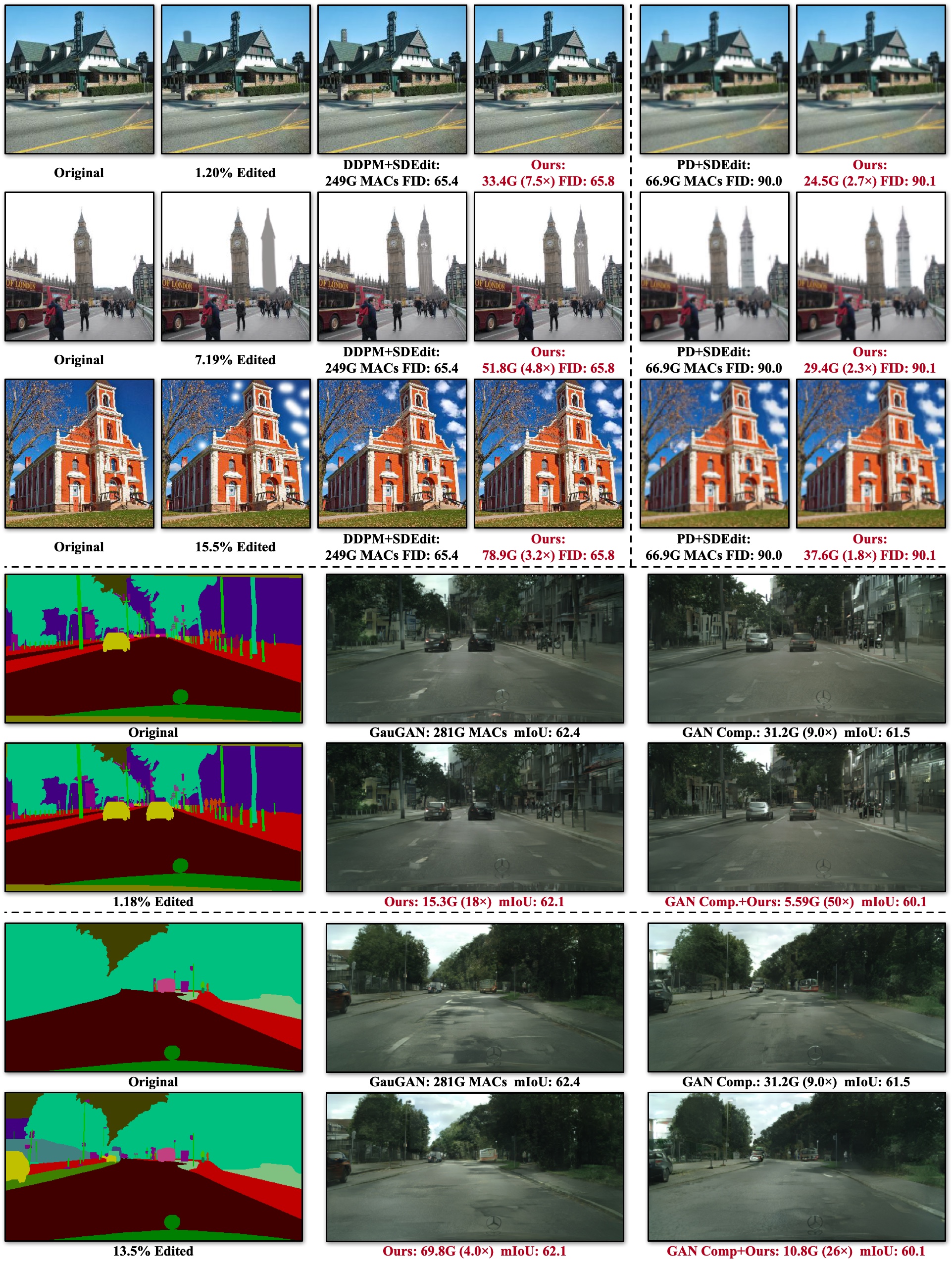 With 1.2% edits, SIGE could reduce the computation of DDPM, Progressive Distillation and GauGAN by 7~18×, achieve a 2~4× speedup on NVIDIA RTX 3090, 3~5× speedup on Apple M1 Pro GPU and 4~14× on M1 Pro CPU. When combined with GAN Compression, it further reduces 50× computation on GauGAN, achieving 38× speedup on M1 Pro CPU. Please check our paper for more details and results.