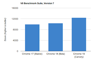 The new test shows the recent improvements V8 has made in handling advanced physics computations: the current Chrome 18 (today in beta) delivers a 5% score improvement compared to the current Chrome 17. Chrome 19 (today in canary), where the full set of improvements is being released, delivers a whopping 25% score improvement compared to Chrome 17.