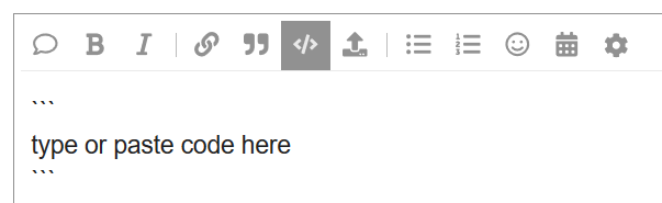 Highlight your code by clicking the </> button in the Discourse composer and type it in between the back-ticks.