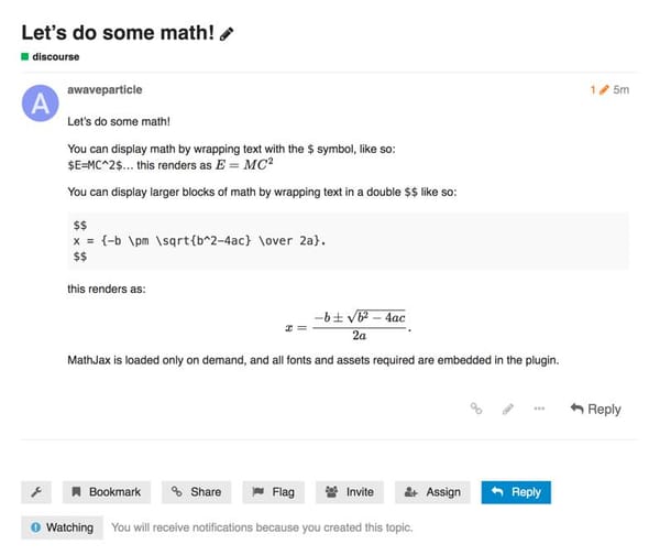 Have you ever wondered if Discourse could help you do math? Our Math Plugin adds support for rendering mathematics within posts using LaTeX. Math can be added inline with text or displayed separately in a dedicated block.