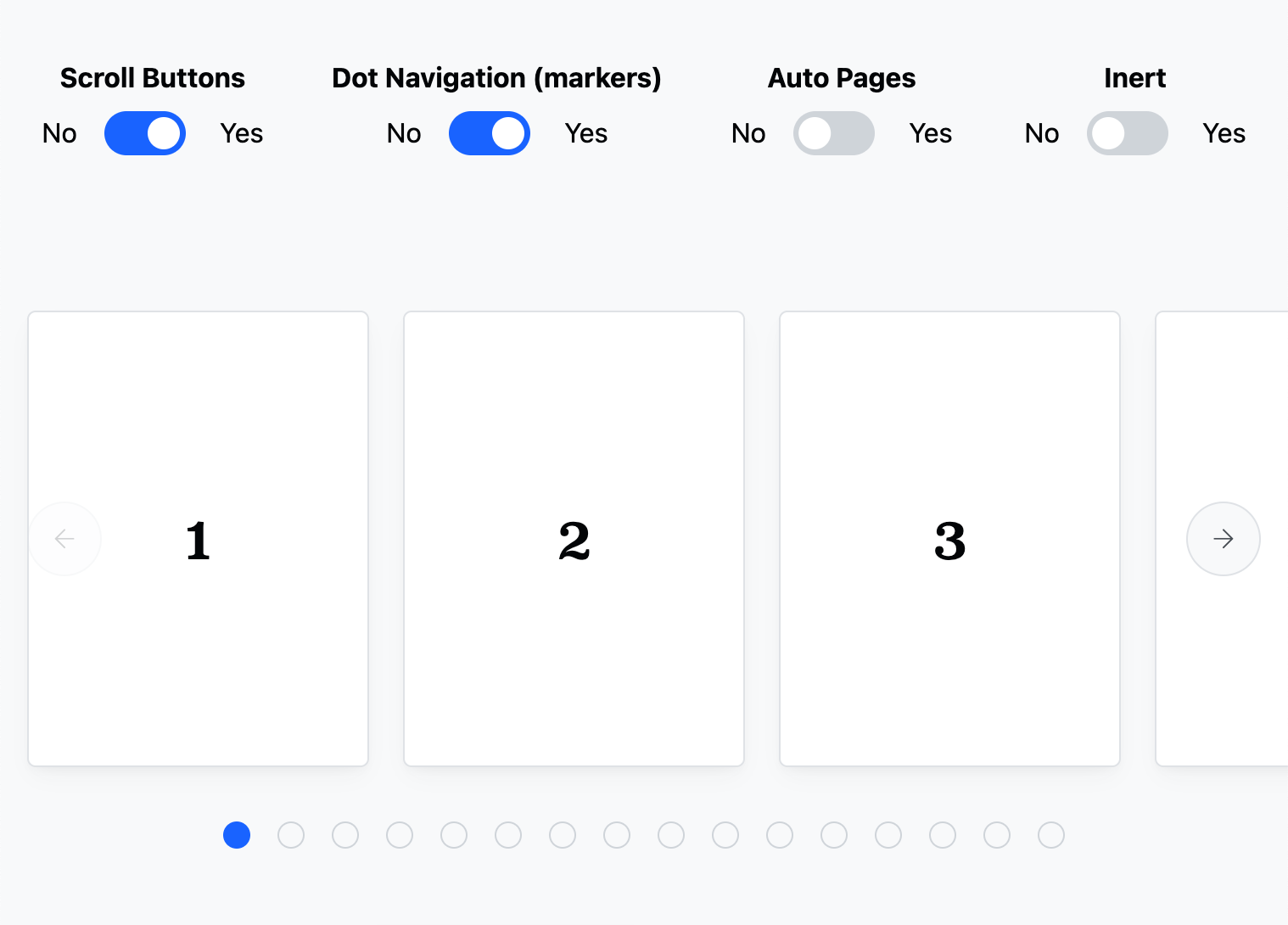 A builder-like experience to help visualize the capabilities of a CSS only Carousel: buttons, markers, paging and inertness.