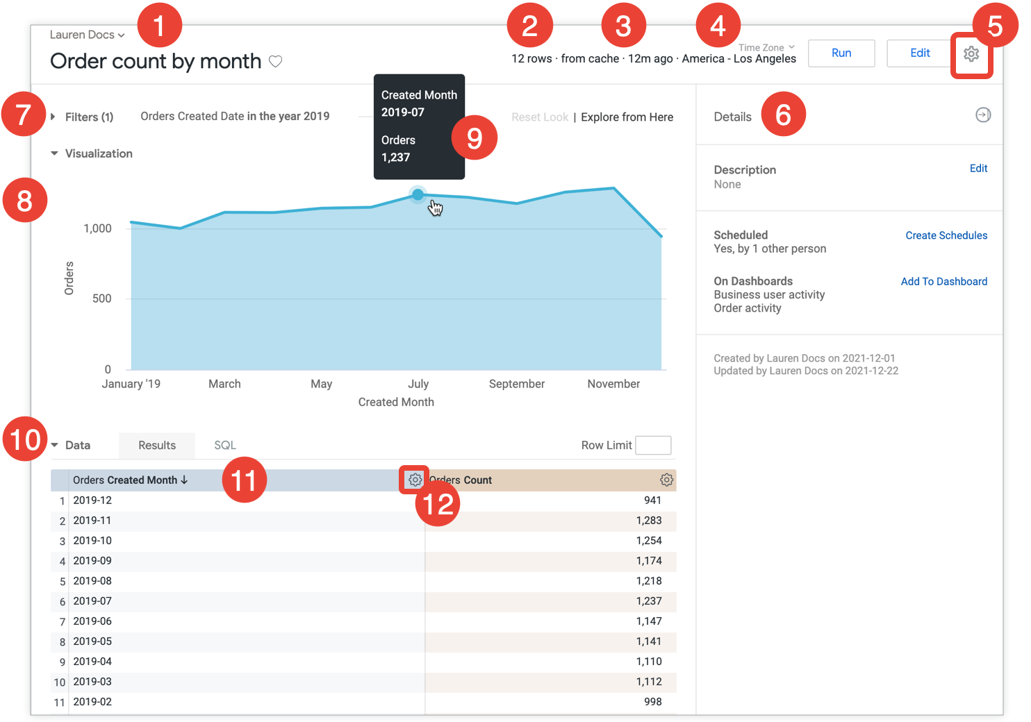 - Information about how many rows are in the Look, how long the query took to run, and how old the data is.