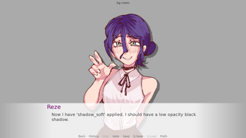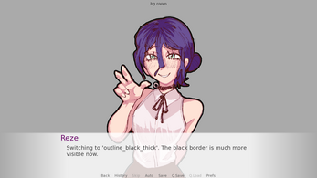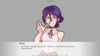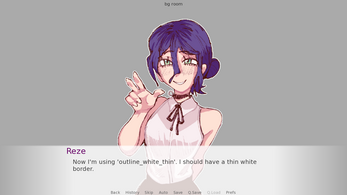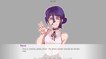 # Applying a white outline preset to a side image sprite image side reze = At("images/reze_side.png", outline_white_thin) # -- # Now define your character using that side image define r = Character("Reze", image="reze") label start: r "As you can see, the outline works on my side image too!"I hope this helps! Feel free to ask if you have any more questions.